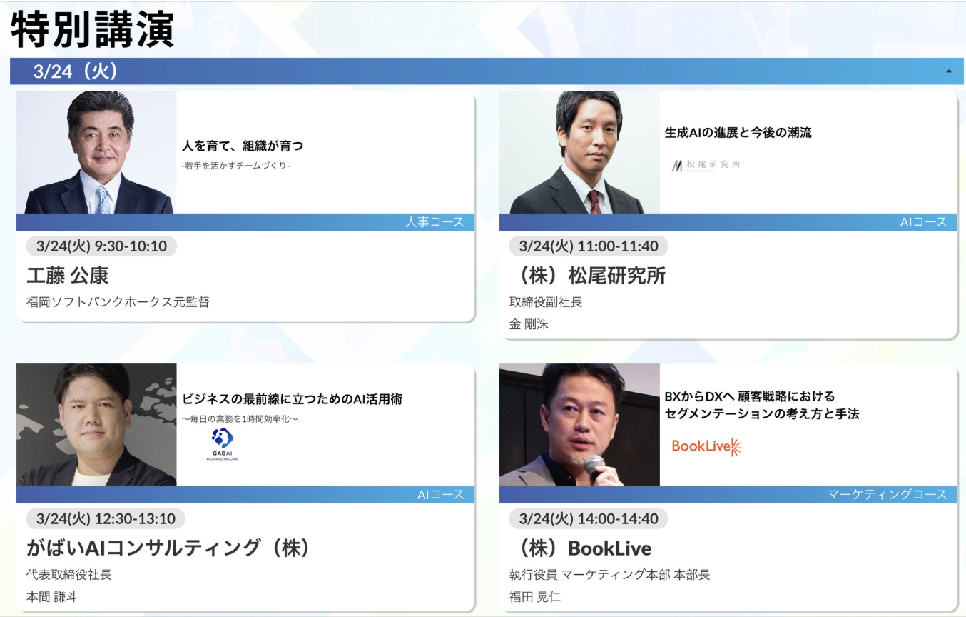 当日は、「松尾研究所 取締役副社長 金さん」「元福岡ソフトバンクホークス監督 工藤公康さん」もご登壇されます。